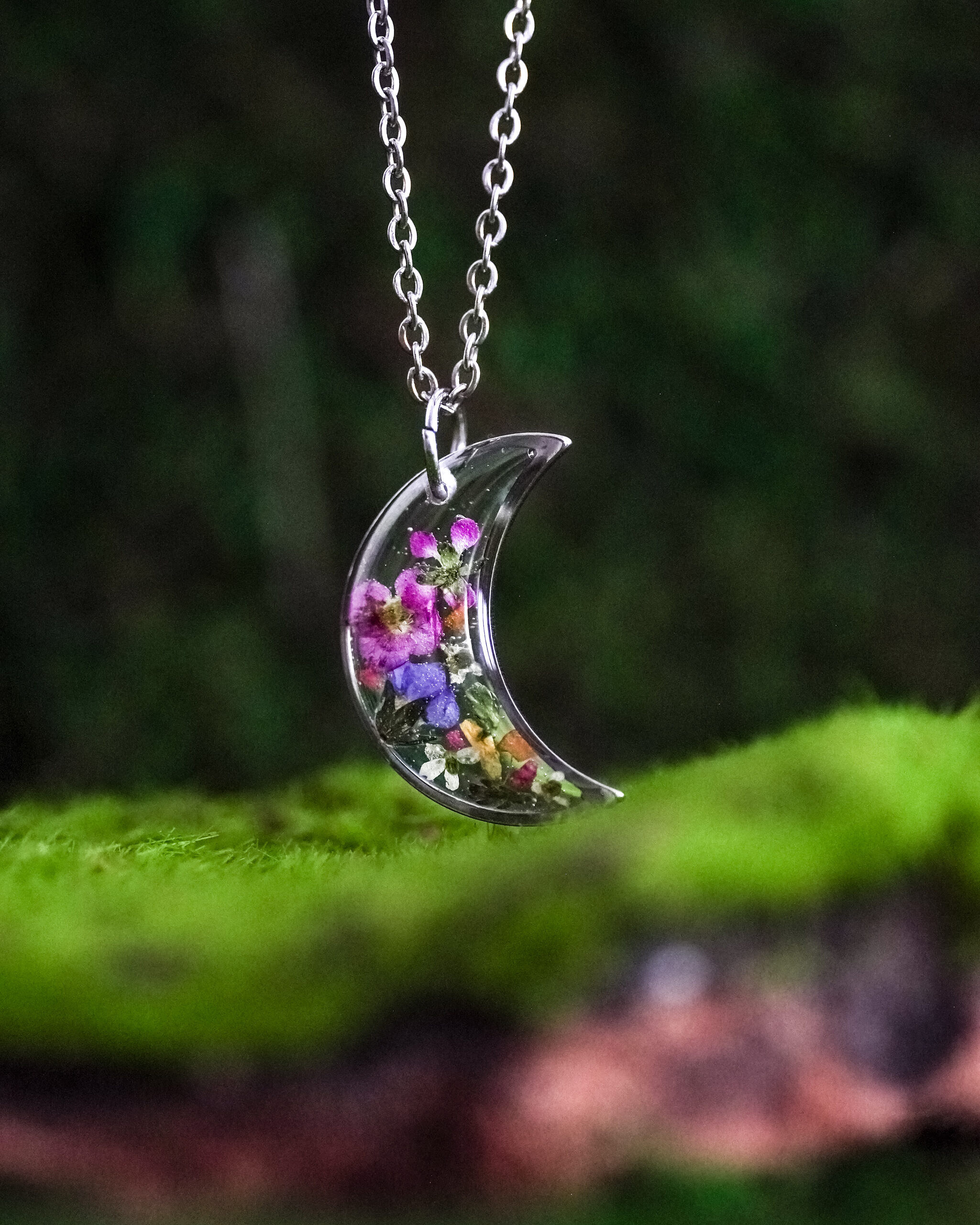 Wisiorek w kształcie księżyca z żywicy epoksydowej, który otula sobą kawałek natury. Transparentny.