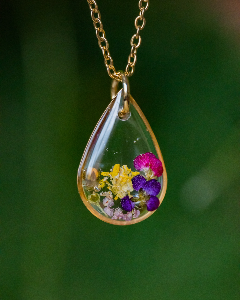 Wisiorek w kształcie kropelki z żywicy epoksydowej, który otula sobą kawałek natury. Transparentny.