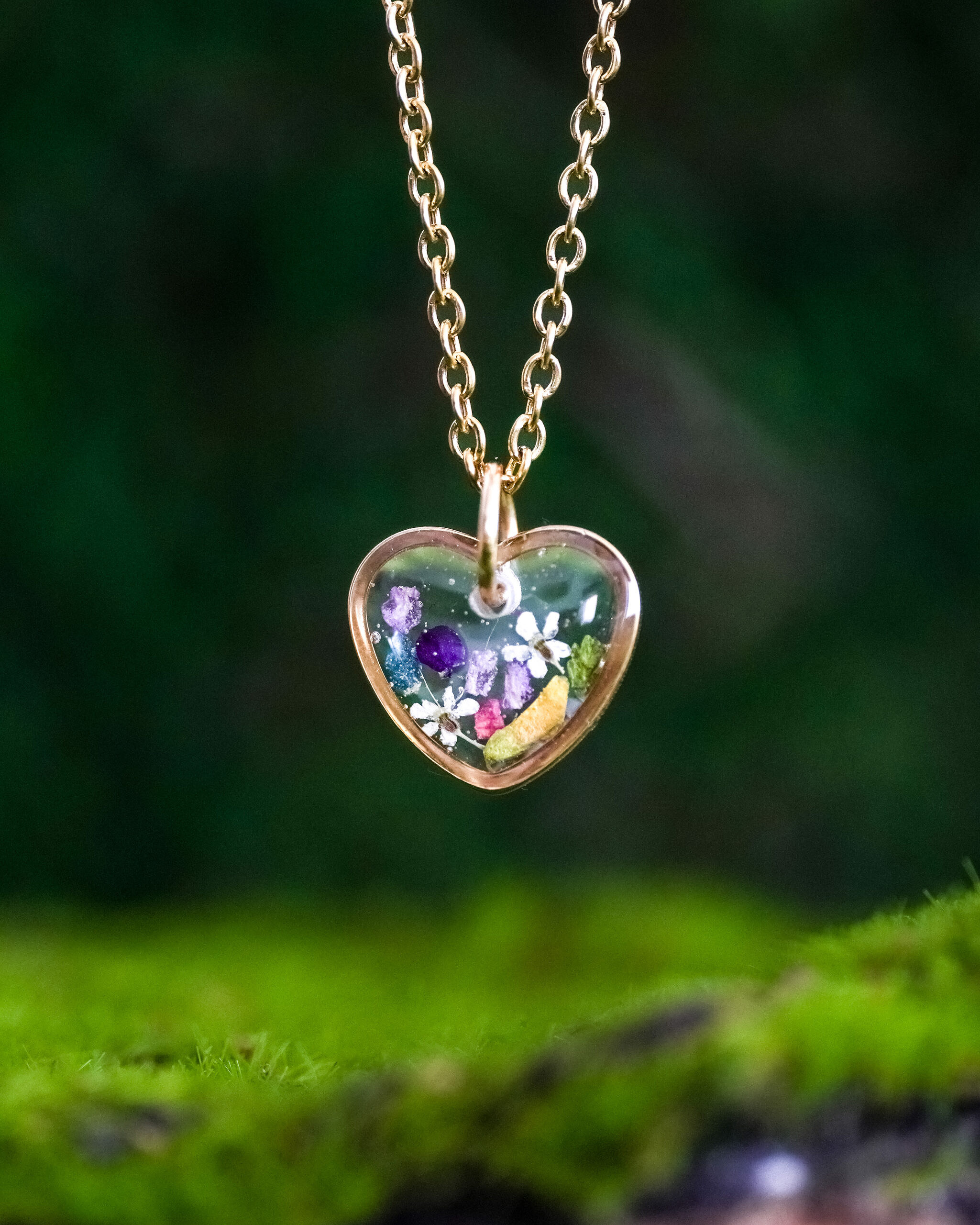 Wisiorek w kształcie serca z żywicy epoksydowej, który otula sobą kawałek natury. Transparentny.