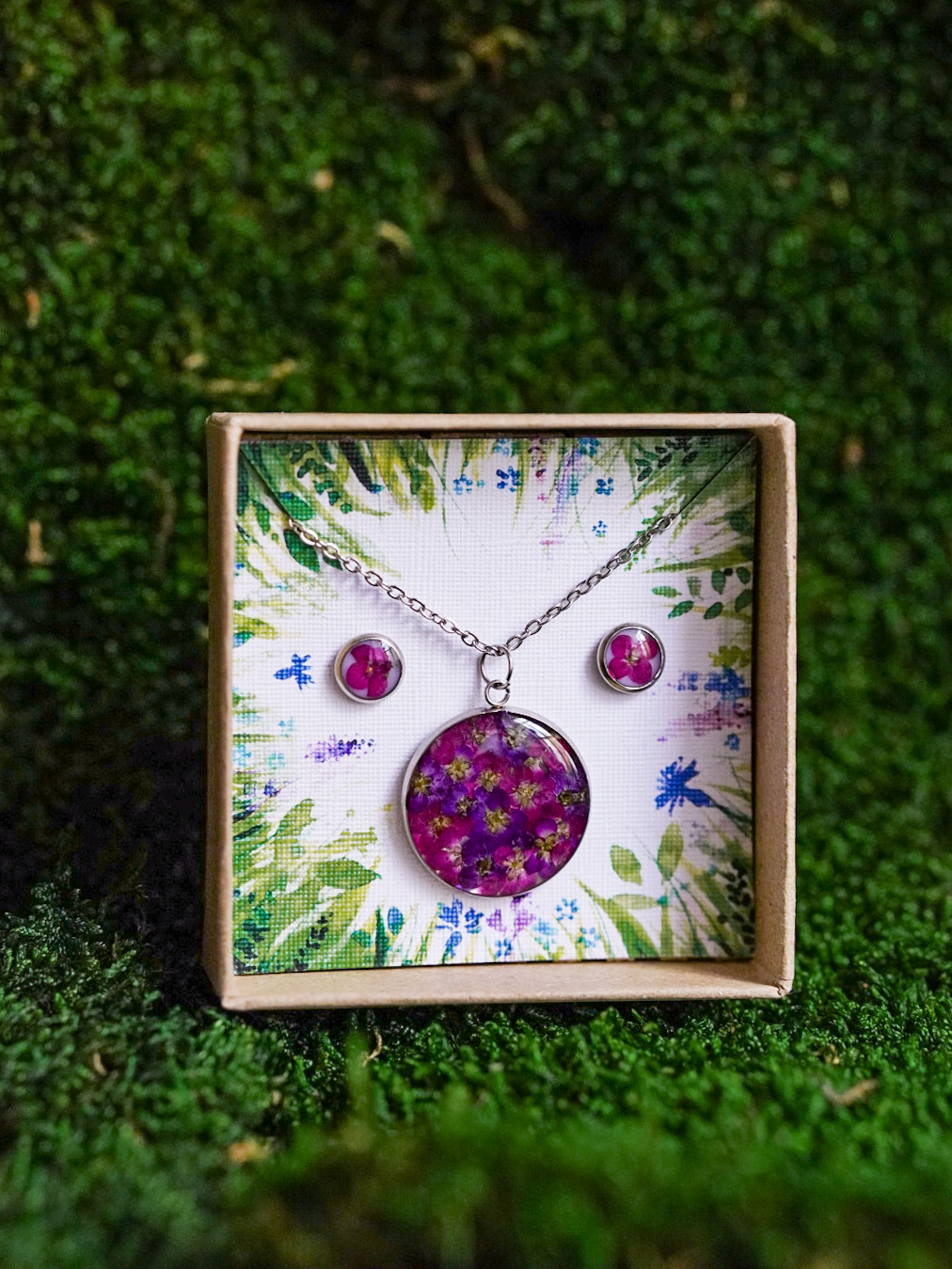 Zestaw naszyjnik z wisiorkiem i kolczyki sztyfty z żywicy epoksydowej, które otulają sobą kawałek natury.